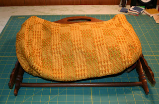 A quilting friend gave me this old time knitting basket. I love the wood frame, so colonial. The bag part had been redone and seemed to be from the 60's or 70's judging from the color and the fact the lining was polyester double knit, gak!